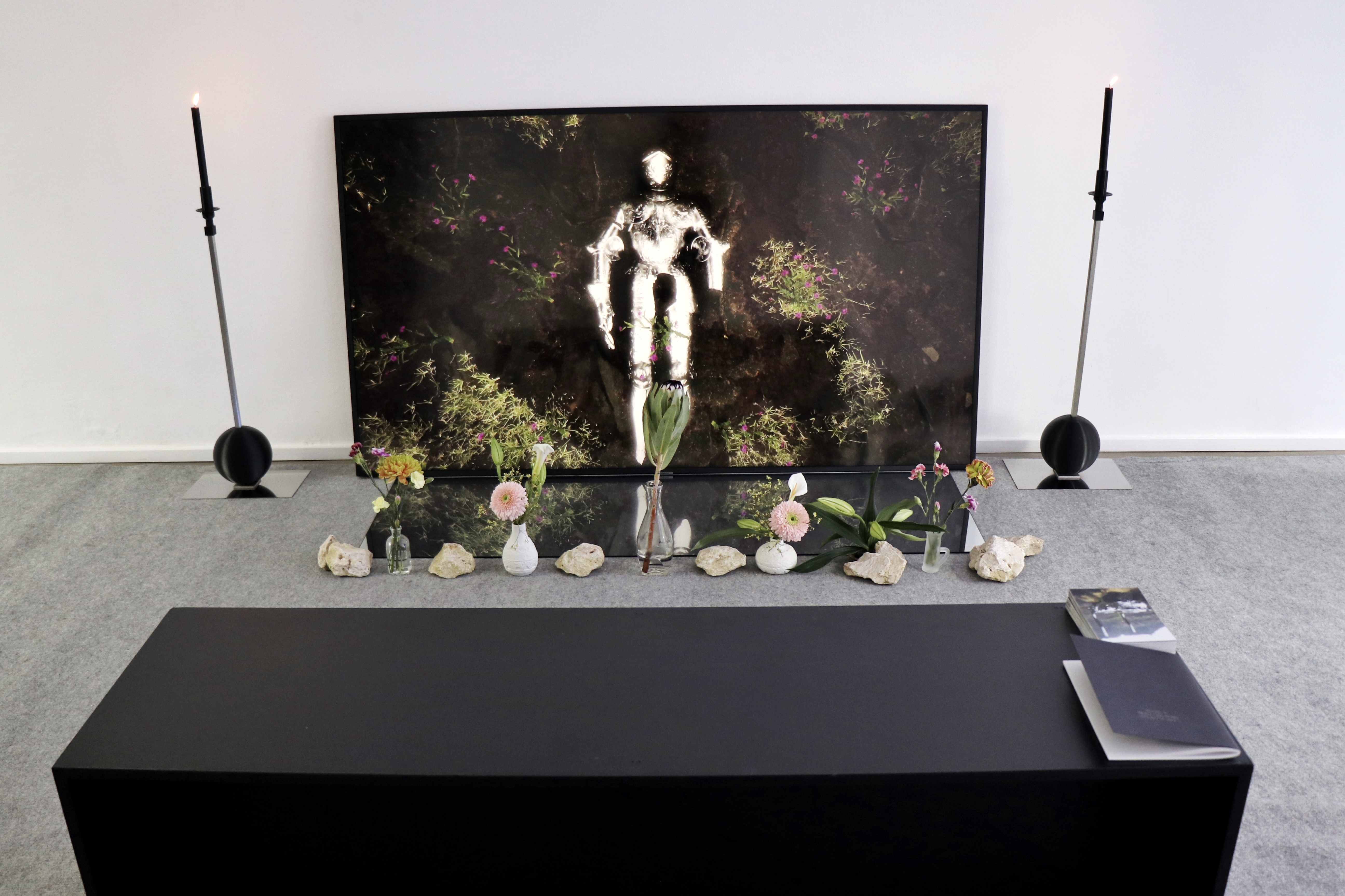 I saw flowers growing from a chair examines the ongoing creative output in art and design through world-building, furniture design, and fashion. It responds to the Anthropocene era’s impact, exploring themes of time, space, fossilization, and decay. The metaphor of the flower acts as a symbol of resistance as objects and entities merge with environments as nature reclaims its way back. The mirror accentuates the duality of this relationship, primarily perceived through indirect means and distorted through screen surfaces.